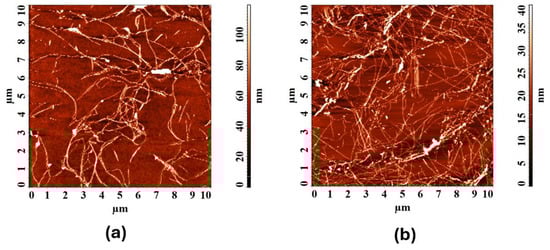The application of AFM shows that the concentration of fibrils at the interface increases with the numbers of the layers and the formed structure becomes denser (Figure 9). SEM images allow the observation of a multilayer morphology (Figure S11 of the Supplementary Materials). It is not homogeneous and consists of irregular domains with some gaps between them, where the multilayer thickness is presumably lower.