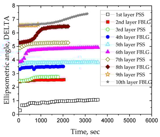 Kinetic dependencies of ellipsometric angle Δ for FBLGp/PSS adsorbtion multilayers: one PSS layer (empty black squares), PSS/FBLG layer, PSS/FBLG/PSS layer (empty green circles), PSS/FBLG/PSS/FBLG layer (blue circles), PSS/FBLG/PSS/FBLG/PSS layer (cyan triangles), PSS/FBLG/PSS/FBLG/PSS/FBLG layer (magenta triangles), PSS/FBLG/PSS/FBLG/PSS/FBLG/PSS layer (empty dark-yellow diamonds), PSS/FBLG/PSS/FBLG/PSS/FBLG/PSS/FBLG layer (wine-colored diamonds), PSS/FBLG/PSS/FBLG/PSS/FBLG/PSS/FBLG/PSS layer (empty orange stars) and PSS/FBLG/PSS/FBLG/PSS/FBLG/PSS/FBLG/PSS/FBLG layer (gray stars).