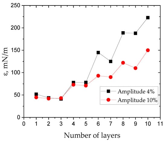 When the multilayer becomes thicker and denser, the surface stress relaxation proceeds slower and the dynamic surface elasticity starts gradually to increase with the increase in the number of layers and reaches about 150 mN/m at a deformation amplitude of 10% when five duplex layers are formed. For a thicker multilayer with more than two duplex layers, its response to compression and expansion becomes non-linear and the surface elasticity strongly increases at a decrease in the deformation amplitude, reaching values of 230 mN/m at an amplitude of 4% (Figure 10). The application of the general stress decomposition method, proposed previously [,], shows the appearance of an asymmetric response of the surface layer to dilation with an increase in the number of layers from five to ten (Figure S13 of the Supplementary Materials). This method gives a possibility to analyze a non-linear response of the surface layer to deformations and is based on the decomposition of the surface tension oscillations into four components, τ1, τ2, τ3 and τ4 (the definitions are given at the end of the Supplementary Materials), which take into account the contributions of higher harmonics. This contribution increases significantly with an increase in the layer thickness.
