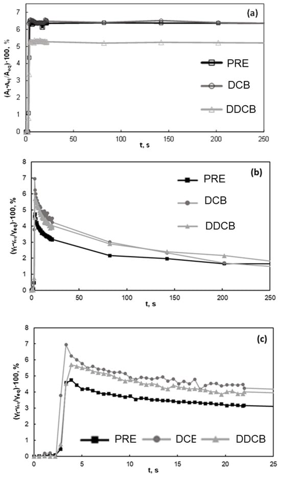 Water/air interfacial tension of the interface of the DCB, DDCB fractions, and PRE fraction at pH 7 following mechanical deformation. (a) area changes during deformation, where Aeq refers to the area of the drop before deformation and At to the area at time t; (b,c) present the consequent interfacial tension changes, where γeq refers to the interfacial tension at equilibrium and before deformation and γt to the interfacial tension at time t. For the definition of WCB, DCB, DDCB, and PRE, refer to Figure 1.