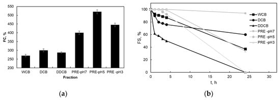 Foaming capacity (FC) (a) and foaming stability with time (b) of foams prepared by the whole cells and the different fractions of C. sorokiniana biomass. For the definition of WCB, DCB, DDCB, and PRE, refer to Figure 1.