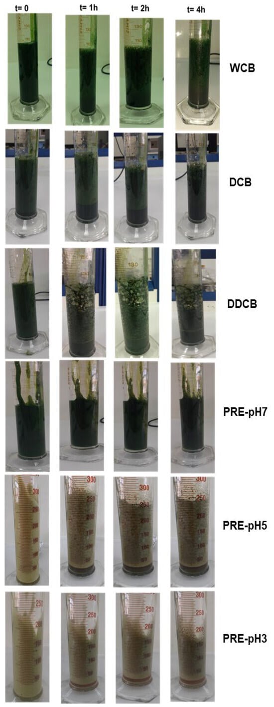 Images of foams made with whole cells and the different fractions of C. sorokiniana biomass immediately after foaming and after 1, 2, 3, and 4 h. For the definition of WCB, DCB, DDCB, and PRE, refer to Figure 1. Magnification ×10.