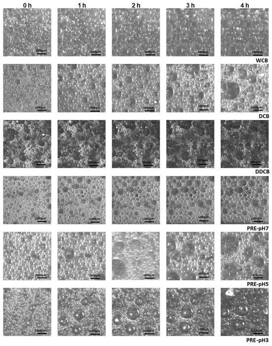 At t0, all fractions except DDCB were characterized by a relatively narrow bubble size distribution ranging from 50 to 600 μm. Over the following 4 h, the distribution broadened and became more skewed for all fractions, indicating an increase in polydispersity. Comparing the bubble diameter at t = 4 h, it is clear that the DCB and the DDCB and PRE-pH5 fractions presented an increased polydispersity, and this is an indication of an imminent collapse resulting from Ostwald ripening [55]. This is supported also by the images shown in Figure 8, where the larger foam bubbles grow even larger at the expense of the smaller ones, which decrease in size. Furthermore, in regards to the effect of pH on the performance of the PRE fractions, the evolution of the bubble size distribution over time is in accordance with what is observed for FS, and the reasons for such differences were discussed above.