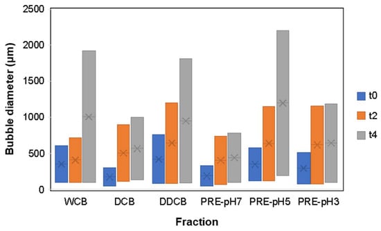 According to the results of Figure 8 at t0, the box widths of DCB and PRE-pH7 were lower than the other fractions, indicating a narrow bubble size distribution; in contrast, the DDCB fraction showed the largest box width.