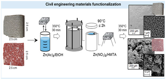 For example, Marie P L et al. [76] grew ZnO nanostructures (NSs) on substrates such as silicon wafers, quartz glass, ceramic tiles, and rock aggregate by hydrothermal method; the specific process is shown in Figure 5, and photocatalytic degradation experiments were performed, and it was found that the photocatalytic degradation efficiencies of ZnO NSs loaded on concrete-based porous materials for the organic dyes methylene blue (MB) and AR14 could reach 98% and 60%.