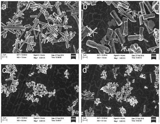 SEM images of ZnO nanorods doped with different concentrations of copper (a,b) ZnO nanorods doped with 5 mg and 10 mg of copper; (c,d) SEM images of ZnO nanorods doped with 15 mg and 20 mg of copper [104].