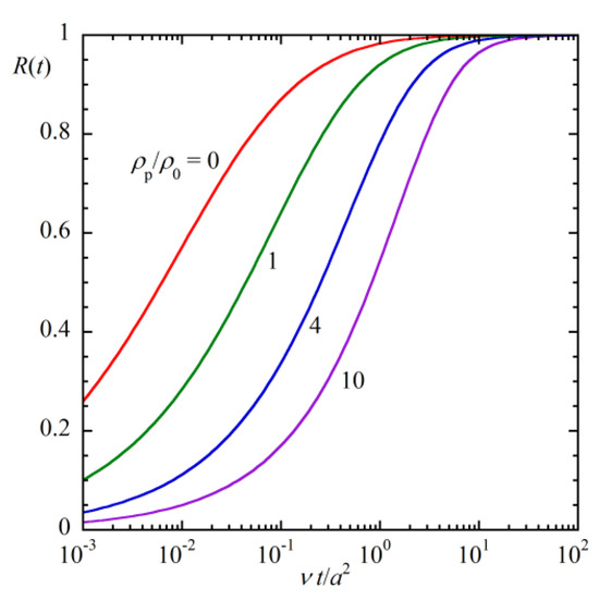 Figure 2 illustrates the behavior of R(t) as a function of the scaled time νt/a2, computed using Equation (79) for various values of the particle-to-solution mass density ratio ρp/ρ0. Figure 2 provides a clear representation of how the transient diffusiophoretic mobility μ(t) changes from its initial value of zero to its final steady-state value μ(∞). It is observed that heavier particles, possessing a larger mass density ρp, exhibit a slower approach to their steady-state mobility, requiring a longer time to reach μ(∞).