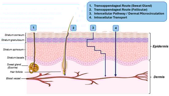 Anatomy of the skin and the penetration of drugs from topical hydrogels through the skin. This figure was created by the authors using BioRender.com (accessed on 5 March 2025) and Microsoft PowerPoint.
