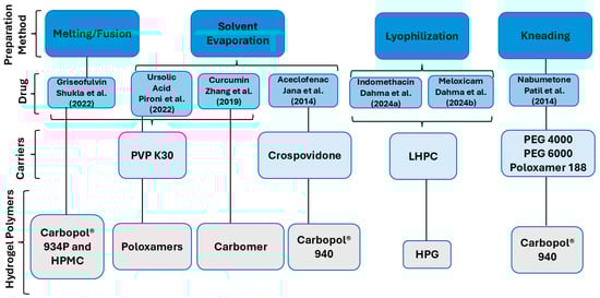 To prepare SDHs, SDs are initially formulated using various methods and materials. The SDs are then incorporated into a hydrogel matrix with different gelling agents, with each contributing to the unique properties of the final SDH (Scheme 1). For instance, an aceclofenac–crospovidone SDH was prepared using Carbopol® 940, a crosslinked polyacrylate polymer known for its high viscosity control, which is beneficial for forming stable gels and suspensions. The Carbopol® 940 gels containing the aceclofenac–crospovidone SD were prepared as follows: the required amount of aceclofenac–crospovidone SD (equivalent to 150 mg of aceclofenac) was dissolved in ethanol and deionized water, respectively, and mixed thoroughly. Next, 100 mg of Carbopol 940, soaked in 6.50 mL of deionized water overnight, was added to the mixture and stirred at 500 rpm for 1 h. Finally, triethanolamine was added to form a clear gel [92].