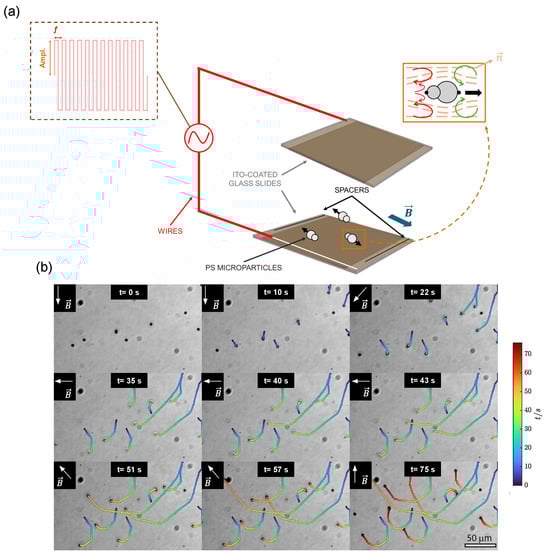 The particles are propelled by the action of a low-frequency AC electric field provided by an electric signal generator (AFG-21012 purchased from Iso-tech, Merseyside, UK). The square wave signal is amplified 20-fold using an electric signal amplifier (PZD700 purchased from Trek, Waterloo, WI, USA). Directionality control is provided by the application of a homogeneous external magnetic field created by a k = 1 Halbach array of neodymium ceramic cubic magnets (25 mm side) built as described by Guillamat et al. [,]. A 400 mT in-plane magnetic field is applied at the center of this structure. See Figure 1 for a schematic representation of the experimental set-up.