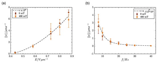 We have verified that the presence of the magnetic field does not significantly alter particle speeds with respect to the off-field values, as we observe in Figure 2, suggesting that the osmotic flows-based propulsion mechanism remains unmodified. In fact, we observe that the trend in the velocity variation of the particles as a function of the applied electric field amplitude or frequency is consistent with what was already observed in previous studies in the absence of magnetic field alignment [,,,]. Indeed, a quadratic dependence on the amplitude (E) is observed, and the variation in the velocity magnitude with the AC frequency (f) has the same functional dependence found earlier []. Note that the quadratic velocity increase with E has the same functional dependence until turbulent flows are triggered by electrohydrodynamic instabilities above a threshold field amplitude.