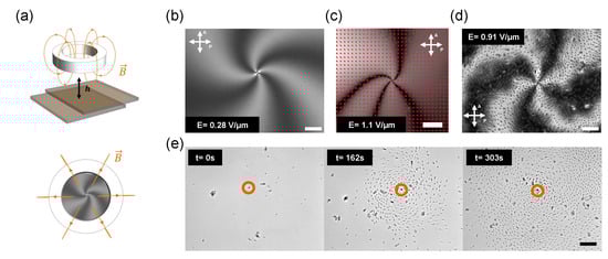 In our case, we create a single umbilical defect [] with a topological charge (one full turn of around the defect) by placing a ring magnet with a toroidal magnetic field [] over the cell surface at a distance (h) of 2 mm (Figure 3a–d). At this distance, the magnetic field has a significant radial component parallel to the LC layer, with a magnitude of 115 mT measured along the axis of the ring magnet with a HGM09s tesla-meter purchased from Goudsmit Magnetics, Netherlands. When an AC electric field of amplitude above the Fredericks threshold ( for LC MLC-7029) is applied between the glass plates, starts changing from the homeotropic alignment imposed by the surface treatment to an in-plane alignment. Similarly to what we explained above for the case of a homogeneous magnetic field, in the present case, the in-plane radial component of the toroidal magnetic field breaks the symmetry during the homeotropic to planar transition, leading to the formation of a defect from which a radial orientational field spanning more than 1 mm2 emanates. Notice that, in Figure 3b–d, does not have a pure radial alignment (pure splay distortion) but, instead, it has a significant rotational component, leading to a spiral pattern when observed between crossed polarizers. This is a consequence of the fact that, for the used mesogen, bend or rotational distortions are less energetically demanding than splay distortions [,]. Moreover, contrary to other techniques, the generated +1 defect is not pinned to the surfaces of the cell, resulting in its spontaneous drifting and allowing the motility of the resulting director field pattern [].