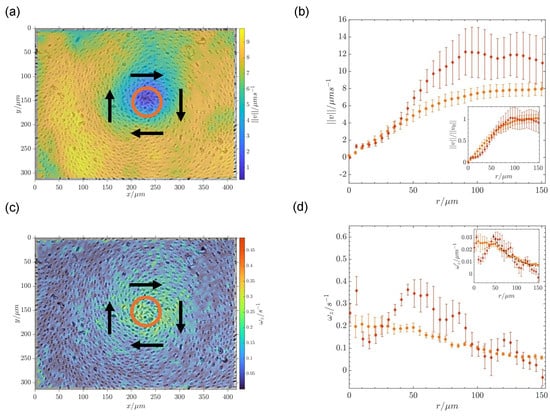 (a) Speed distribution for particles surrounding a +1 defect under an electric field with parameters E = 0.91 V/m and f = 25 Hz. (b) Speed variation as a function of the radial position within the mill for (∘) E = 0.91 V/m and (⋄) E = 1.12 V/m (f = 25 Hz). In the inset, the speed has been normalized with the average speed of sparse particles. (c) Vorticity () distribution for the same rotating mill shown in panel (a). In both panels, the orange circumference indicates the region within which the defect wanders randomly during the experiment. Black arrows show the direction of rotation of the mill. (d) Vorticity variation as a function of the radial position within the mill obtained through application of Equation (1) to the speed data in panel (b). The inset includes the same calculation for the normalized speed data in the inset of panel (b). The black dashed line indicates the decay of with the inverse of r.