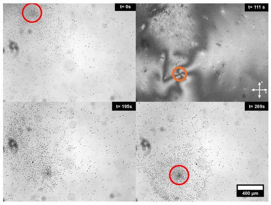 The ability to assemble large numbers of driven colloids around a designated point can also be used as an initial step to control the motion of particle swarms. This was earlier demonstrated by Hernàndez-Navarro et al. [] using a reconfigurable photosensitive anchoring layer, and we can also do it here in an easy manner using a combination of magnetic fields. For this purpose, first, we condense a particle cluster using the ring magnet and an AC electric field, as described above. Next, we switch off the AC field and displace the ring magnet to a different location. Finally, we switch on the AC field again to provoke the propulsion of the particles. As we can observe in Figure 5, particles move as a swarm towards the location of the new +1 umbilical defect created at the new location of the ring magnet.