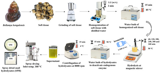 Snail protein hydrolysates (SPHs) were prepared according to Vaishnav et al. [33], with specific modifications. Figure 1 shows the detailed procedure of SPH preparation. Snail soft tissue was thawed at 27 ± 3 °C, sliced, and ground into a paste. Flash paste was mixed with double distilled water at a 1:1 ratio and homogenized at low speed for 2 min. The mixture was heated to 85 °C for 20 min to inactivate endogenous enzymes and then cooled, and the pH was adjusted to 7 with 0.1 N NaOH/HCl solutions. The material was subsequently agitated via a magnetic stirrer at 50 °C for hydrolysis. Bromelain was added at a 1:100 ratio (w/w) to initiate hydrolysis, and the pH was meticulously controlled. Following hydrolysis, the mixture was heated to 90 °C for 20 min to deactivate bromelain. After centrifugation at 8000 rpm for 10 min, the supernatant was collected and stored at −20 °C for future use.
