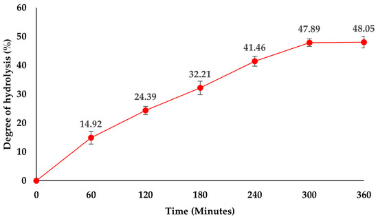 Degree of hydrolysis of snail protein hydrolysates at different time intervals. The values are presented as the mean ± SD (n = 3).