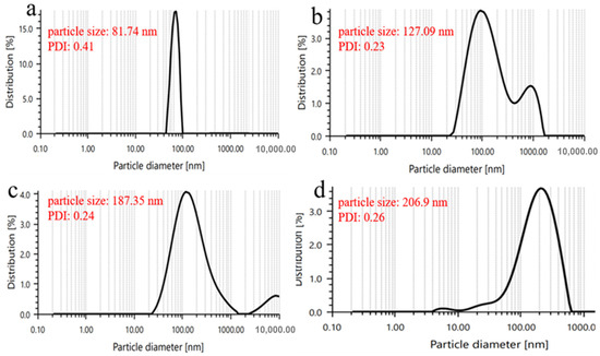 Particle size distributions of SPH and carrageenan-encapsulated SPH at different concentrations: (a) SPH without encapsulation, (b) 1% carrageenan-encapsulated SPH, (c) 2% carrageenan-encapsulated SPH, and (d) 3% carrageenan-encapsulated SPH.