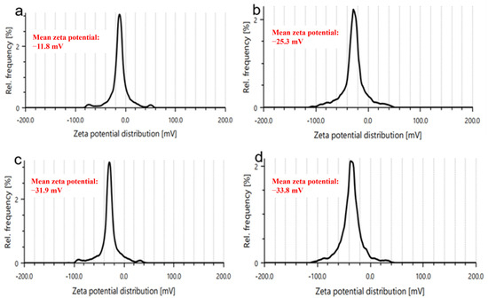 Zeta potential of SPH and carrageenan-encapsulated SPH: (a) SPH without encapsulation, (b) 1% carrageenan-encapsulated SPH, (c) 2% carrageenan-encapsulated SPH, (d) 3% carrageenan-encapsulated SPH.
