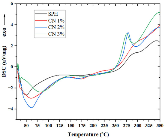 The DSC thermograms for spray-dried SPH and its encapsulated forms with 1%, 2%, and 3% carrageenan are shown in Figure 6. DSC analysis provides insight into the thermal transitions and stability of samples, which is essential for understanding their encapsulation effects and potential applications in food preservation [99]. The DSC thermogram of SPH without encapsulation shows an endothermic peak near 60 °C, indicating the denaturation or thermal transition of protein components [100]. This is a common feature in protein hydrolysates due to the unfolding of peptide chains when subjected to heat. Beyond this temperature, the DSC curve gradually increases to approximately 325 °C, indicating the thermal degradation of the protein structure, which is characteristic of the breakdown of organic molecules into smaller volatile compounds [101].