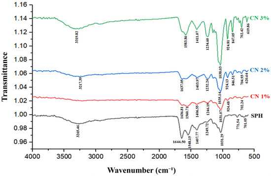 FTIR spectroscopy was used to evaluate the structural interactions and molecular characteristics of the encapsulated SPH at various concentrations (1%, 2%, and 3%) of carrageenan (CN). The spectra displayed in Figure 7 and Table 4 show significant peaks corresponding to various functional groups, which provide insights into the encapsulation process and the interaction between the protein hydrolysates and the encapsulating agent.