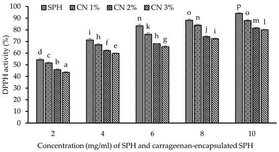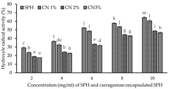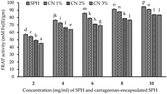 The encapsulation of SPH with carrageenan significantly reduced the solubility, with elevated concentrations of carrageenan (CN 3%) yielding the most substantial reduction. At pH 2, the solubility decreased from 97.32% for SPH to 43.28% for CN 3%. The reduction in solubility is probably attributable to the interaction between the carrageenan matrix and the protein hydrolysates, which may restrict the exposure of the peptides to the aqueous environment and decrease their solubility [98]. Despite this reduction, encapsulation could still be beneficial, mainly in applications where controlled release or protection of bioactive peptides is desired. A lower carrageenan concentration (1%) resulted in better solubility, suggesting that a balance between encapsulation and maintaining functional properties such as solubility can be achieved by optimizing the carrageenan content. However, the decreased solubility at higher carrageenan concentrations may limit the effectiveness of these encapsulated hydrolysates in certain food applications, especially in products requiring high solubility.