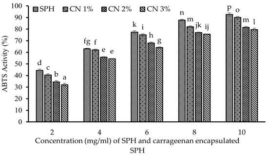 Table 3 presents the solubilities of spray-dried SPH and its encapsulated variants with carrageenan at various concentrations (1%, 2%, and 3%) throughout a range of pH values (2–10). Solubility is a major functional property of protein hydrolysates, considerably affecting their application in food and nutraceuticals [95]. The solubility of encapsulated hydrolysates is an essential indicator of their efficacy in delivering bioactive chemicals [96]. The solubility of nonencapsulated SPH was generally greater over the pH range, with minor fluctuations. At pH 2, the solubility was 97.32%, increasing to nearly complete solubility at pH 4 (99.97%) and sustaining a high level throughout the range, with a minor decrease to 94.61% at pH 10. These data demonstrate that SPH has exceptional solubility across both acidic and alkaline pH ranges. Encapsulation with carrageenan at different concentrations resulted in reduced solubility across all pH ranges. At 1% carrageenan, the solubility ranged from 72.13% at pH 2 to 70.87% at pH 10. With 2% carrageenan, the solubility ranged from 58.31% at pH 2 to 51.76% at pH 10. Finally, at 3% carrageenan, the solubility was the lowest, ranging from 43.28% at pH 2 to 41.10% at pH 10. The results indicate that the solubility of SPH is exceptionally high, particularly in acidic environments (pH 2–4), which is consistent with prior findings indicating that protein hydrolysates generally exhibit good solubility because of their relatively small peptide sizes and the presence of polar amino acid residues [19,97]. This high solubility across a broad pH range makes SPH a suitable ingredient for inclusion in various food matrices, where pH conditions may vary.