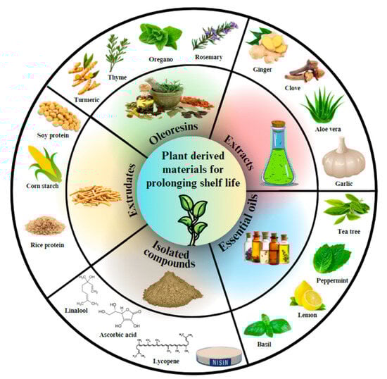 Notably, plant-based coatings extend shelf life and offer nutraceutical benefits, enhancing the nutritional value of treated fruits. Natural antioxidants and antimicrobials are mainly derived from plants through pure bioactive chemicals, fruit, root, leaf, seed extracts, essential oils, peptides, and so on (Figure 3) [52]. Various bioactive substances have significant antimicrobial action, like phenolics, terpenes, aliphatic alcohols, aldehydes, acids, and flavonoids [53]. For instance, extracts from sources like pomegranate peel, garlic, ginger, green tea, and karonda are being explored as potential alternatives to synthetic coatings [54,55,56]. These extracts, rich in bioactive compounds, mitigate postharvest losses and maintain fruit freshness.