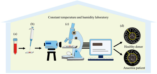Schematic diagram of blood sessile droplet evaporation processes: (a) extraction of blood samples from patients with different health statuses; (b) deposition of a blood droplet onto an ultra-clean glass substrate; (c) real-time monitoring of pattern morphology evolution using an optical microscope coupled with a contact angle measurement system; (d) comparative analysis of morphological characteristics between blood samples from healthy donors and anaemia patients. All experimental procedures were performed under strictly controlled ambient conditions within a constant temperature and humidity laboratory.