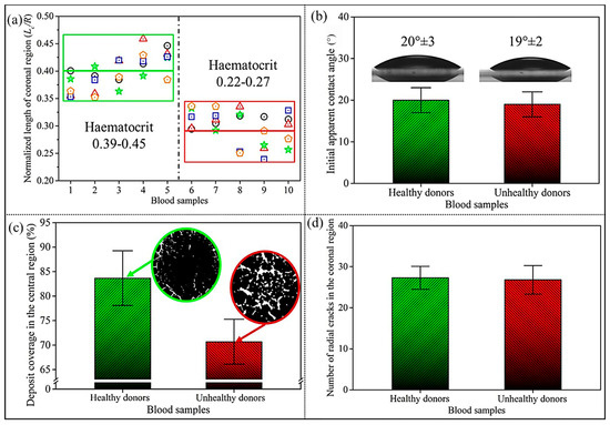 (a) The normalised length of the coronal region () in desiccated blood sessile drops from healthy donors with normal haematocrit levels (green frame) and patients (red frame) with low haematocrit levels, respectively. Different symbols denote distinct experimental batches of repeated blood sample evaporation trials. (b) The initial apparent contact angle () of blood sessile drops in (a). (c) The coverage area of the desiccated blood deposits (%) in the central region; the insets show black-and-white images of the desiccation patterns in the central region. (d) The number of regularly ordered radial cracks in the coronal region.
