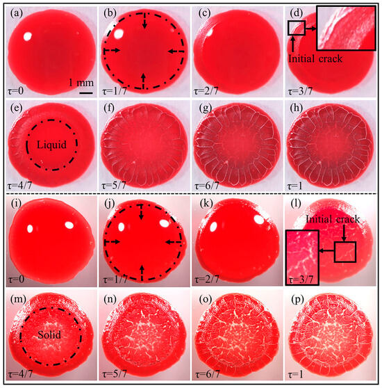 Morphological evolution of the desiccation patterns of blood samples collected from (a–h) a healthy adult donor with a normal haematocrit level of 0.43 and (i–p) an adult patient with a low haematocrit level of 0.26, respectively; the normalised evaporation time (), indicated in the left bottom of each image, was derived by scaling the instantaneous evaporation duration () against the total time required for complete desiccation (), i.e., ; the dashed circular line (black) represents the front line of the gelation process, which propagates from the drop edge to the drop centre (indicated by the dashed arrows); the insets in (d,l) show the locations of the initial cracks.
