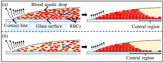 Estimation by Equations (1) and (2) shows that the wedge-shaped space of the wetting front of the blood sessile droplets in different haematocrit levels have the similar volumetric capacities () to house the incoming RBCs driven by the “coffee ring” effect, as illustrated in Figure 4.