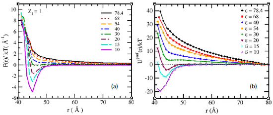 For a 60:1 system in different solvents with dielectric constants given in Table 1, Figure 1a shows the mean force between two like-charged macroions and their counterions trapped in a cylindrical cell as a function of macroion spacing r. The potential of mean force pmf, promoted by integrating the mean force using Equation (10), is shown in Figure 1b.