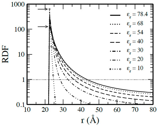 Macroion–counterion radial distribution functions (rdfs) for two highly charged macroions and monovalent counterions in solutions with dielectric constants as indicated in the figure. Reproduced from Qamhieh et al. [23].