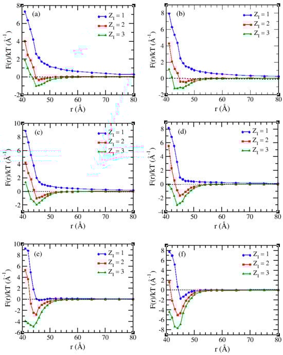 The mean force (Å−1) between two highly charged macroions as a function of their separation r for the 60:1 (ZI = 1), 60:2 (ZI = 2), and 60:3 (ZI = 3) cylindrical cell systems. The results are presented for different relative permittivities: (a) = 78.4; (b) = 68; (c) = 54; (d) = 40; (e) = 30; (f) = 20.