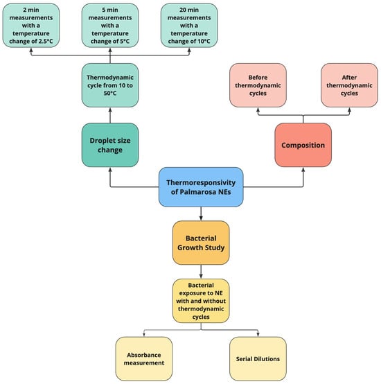 Following the NE preparation, the methods are presented in terms of our main research lines previously declared: thermoresponsive tracking of droplet size distribution, comparative chemical composition, and compared antibacterial effectiveness of NE under thermal cycles. These tests are synthetically presented in Figure 1, which also contains the analysis methods depicted below.