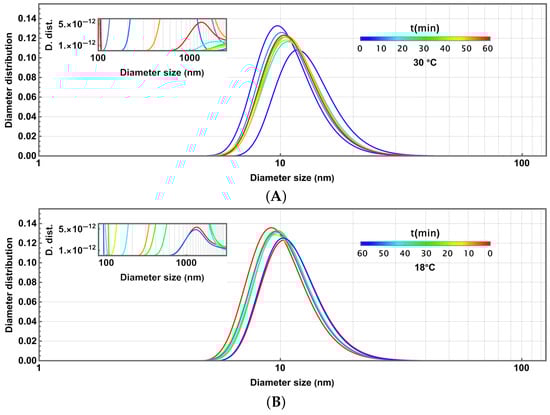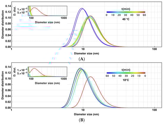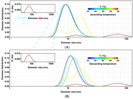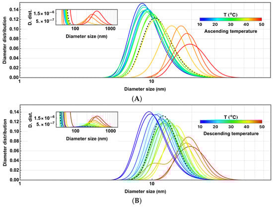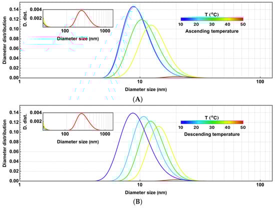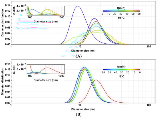 Thus, Figure 3A shows the distributions obtained with 5 min of waiting at the temperatures depicted in colour, as before. The dynamic process is observed to be more uniform as the temperature increases, but it accelerates at higher temperatures. Notice how the secondary peak is now visible on the scale presented in the inset only for 50 °C, despite existing at lower temperatures (secondary peaks at other temperatures still exist, but on a much smaller and negligible scale). This behaviour shows a closer approximation to a state of equilibrium after 5 min at a stable temperature. Figure 3B shows a similar and more uniform behaviour when returning, with a configuration very similar to the initial one at 10 °C. Although the position of the maximum in the distribution is now much more similar to that observed in Figure 2A,B, it is possible to see a decrease in its height, suggesting that the secondary peak prevails in the final stage (although negligible in the upper inset of Figure 3B). The behaviour of the NE at 50 °C stands out, where the original distribution has practically disappeared, while the substitute distribution between 100 and 1000 nm dominates.