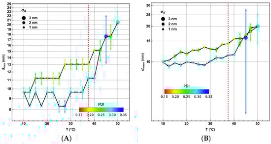 For the 2 min waiting time before measurement, the evolution data during the heating and cooling cycle are represented in Figure 5A,B for the characteristic diameter (in nm), (peak of distribution), and the mean radius, , respectively, as a function of temperature, T (horizontal axis, in °C). Both graphs report the margin of error obtained from the triplicate repetition of the experiment as vertical error bars. Additionally, the PDI is reported in colour, according to the bar included as an inset. The size of the reported point refers to the standard deviation of the average distribution (of the three experiments) at each temperature, according to the scale included in the form of black circles.