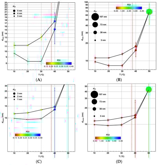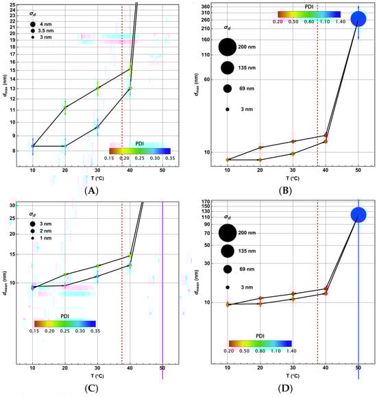For the heating–cooling cycle with 5 min of waiting before the droplet size dispersion measurement, Figure 6 presents the corresponding results of Figure 3. In this case, the characteristic diameter is reported for convenience in Figure 6A,B, showing, respectively, a partial view at low temperatures and the global view afterwards. Similarly, Figure 6C,D show the mean diameters in a similar way. Note that each panel includes a different scale to report the PDI. Although fewer temperatures are reported, we observe a smoothing in the process, primarily because of the extended waiting time. Notice how, for , the process becomes similar to that of . The variation in PDI is stable and reduced with respect to the previous case. The average diameter at the end of the process has increased slightly from its initial value. Again, a large dispersion is observed for the temperature of 50 °C, as well as a remarkable variability in the experiments that leads to higher errors, mainly due to the multimodality of the distribution reported by the DLS equipment. The stable behaviour above body temperature () is appreciable.