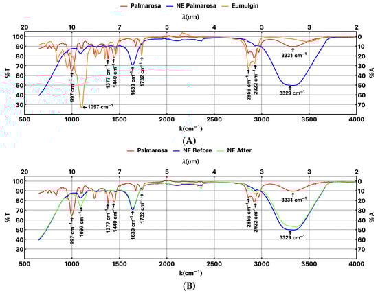 Stability is a crucial property that is expected in emulsions. Moreover, the most current agreement on the classification of microemulsions (MEs) and NEs regards not only their droplet size characteristics but also their type of stability, thermodynamic or kinetic [,,], respectively. In NEs, this property indicates whether the system will remain characterised by a droplet-size nanoscale for an extended period or whether it will transition into a conventional emulsion, thereby losing the properties potentiated by this scale. This situation is relevant if the NE requires long storage periods before its final application. Previous DLS-based droplet size analysis showed that Palmarosa NE with 5% essential oil had a very stable average size. With an initial characteristic diameter of 11.4 nm and a PDI of 0.226, these values evolved one year later to 9.94 nm and 0.300 while the NE was kept at a reasonably constant room temperature and stored in darkness.