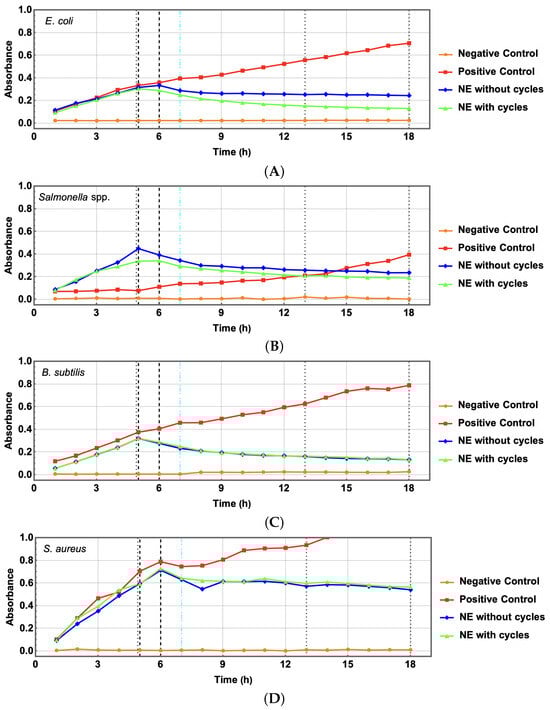 The bacterial growth of the four bacterial strains was performed to evaluate the antibacterial efficacy of the NEs. The experiment was carried out over 18 h, measuring the OD of the samples each hour as a parameter of bacterial growth. The inoculum of each of the four bacteria (E. coli, S. aureus, B. subtilis, Salmonella spp.) was made in 50 mL of nutritive broth flasks by adding 5 mL of microorganisms to each. The inoculum was used until the OD reached a value of 0.3, considering the nutrient broth without bacteria as a blank.