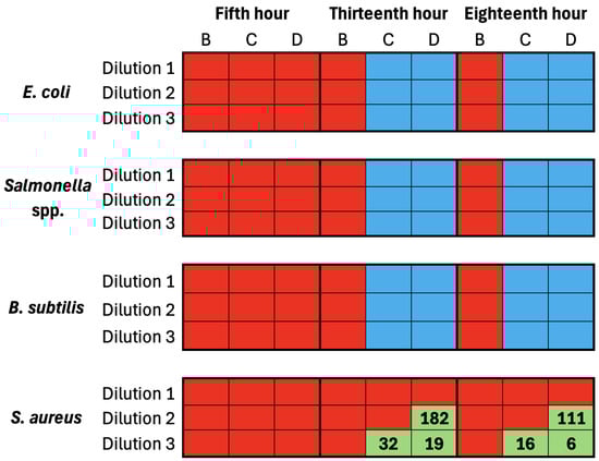 To determine the comparative efficacy of the NE before and after thermal cycles, a comparative kinematic growth test of bacteria was performed by measuring the relative absorbance using the OD concept [,]. The change in OD can be helpful for a qualitative determination of the efficacy of an NE compared to the kinetic growth of the microorganism without treatment. The kinetics were performed for more than an hour, and samples were taken at the 5th, 13th, and 18th hours of the experiment. Furthermore, serial dilutions were performed to approximate Colony-Forming Units (CFUs) using the SP technique, thus quantitatively determining the number of bacteria per millilitre of sample when exposed to NEs [,].
