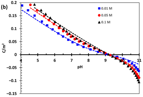 Chloride is known to bind more strongly than nitrate to oxide surfaces; this is evident in the experimental proton charging data on goethite (Figure 1), which is also manifested in the optimized intrinsic binding constants of −0.1 log units for Cl− and −0.60 log units for nitrate (Table 2). A similar difference had been reported previously by Hiemstra and co-workers [4], but their values were −0.5 and −1 log units, respectively, i.e., 0.4 log units lower than our values. This is probably because they approximated the log value of both goethite acidity constants (i.e., to SC and TC sites) to the goethite PZNPC of 9.2. Also, they used a Basic Stern model with an extremely high value of capacitance of 0.9 F/m2, whereas our total capacitance value for the extended Stern CD-MUSIC model is 0.42 (= 1/[1/0.93 + 1/0.75]) (cf. Table 2), in which both capacitance values are close to each other. The latter approach was later used by Hiemstra and collaborators, e.g., in [25,26], with the corresponding values of their capacitances being 0.85 and 0.75 F/m2 [25] or 0.92 F/m2 [26] for both (yielding total capacitances of 0.40 and 0.46, respectively). In the latter case, their intrinsic affinity values for Cl− and NO3− binding were corrected to −0.45 and −0.7 log units, respectively, but both acidity constants were still approximated to the PZNPC (of 9.0). Finally, their total site density for goethite refers to ideal goethite crystals made of pure face {101} on their elongated section and pure face {210} at the tips, which yield values of 3.45 SC sites/nm2 and 2.7 TC sites/nm2. Compare these values to 4.24 and 2.21 sites/nm2, respectively, for the 76 m2/g goethite (Table 1), according to our previous calculations [6].