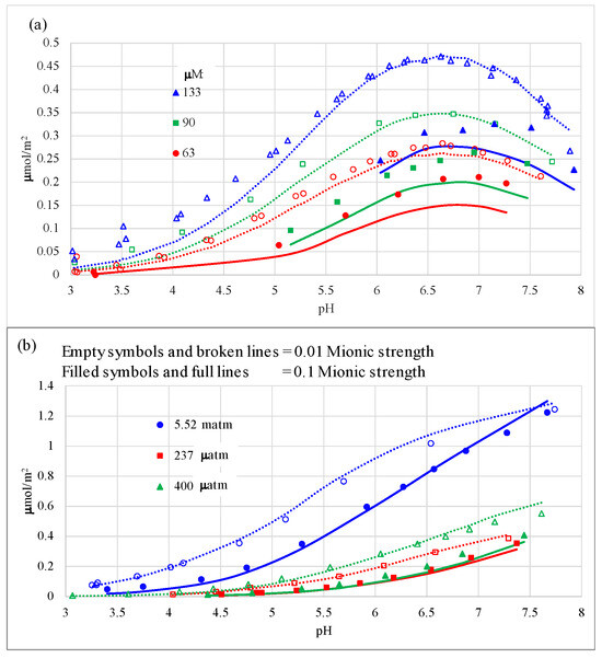 It is noteworthy that the model is able to capture the crossover and increase in carbonate adsorption at high ionic strength and high pH values over the adsorption at low ionic strength for open systems at high pH values, e.g., at 327 μatm at pH values above 8 (Figure 4c), especially at 5.52 matm at pH values above 7.5 (Figure 4b). In these regions, the adsorbed concentrations at 0.1 M ionic strength surpass those at 0.01 M, whereas at lower pH values, the 0.1 M ionic strength systems yield considerably lower carbonate adsorption because of competition with the electrolyte anion. This may be explained by the fact that in open systems, the total aqueous carbonate concentration present is growing logarithmically with pH after the first carbonic acid pKa (ca. pH of 6.3), and the increase is larger as ionic strength increases in such a way that the dissolved bicarbonate becomes progressively larger with pH at 0.1 M ionic strength than at 0.01 M (cf., Figure 7 in [2]). It was not necessary to invoke an outer-sphere surface carbonate complex with Na+ at high pH and ionic strength, as was done previously [3,4,27].