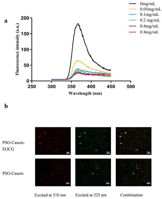 To understand the microstructure among PSO, EGCG, and casein, the binding condition between casein and EGCG was investigated firstly. For casein, the endogenous fluorescence spectra of proteins were determined by tryptophan, tyrosine, and phenylalanine residues. Of the three amino acids, tryptophan is the most sensitive to changes in environmental polarity and molecular structure. Therefore, it is often used as a fluorescent probe to study protein–polyphenol interaction. For EGCG, the three hydroxyl groups in the benzene ring are attached to the ester groups, which tend to form hydrogen-binding proteins and protein complexes [20]. As such, the interaction between casein and EGCG will result in fluorescence quenching. Therefore, the binding condition between casein and EGCG was determined by observing fluorescence quenching. As shown in Figure 1a, the fluorescence intensity was the highest when EGCG was not added and decreased as EGCG was added. This result suggested that EGCG bound with casein.