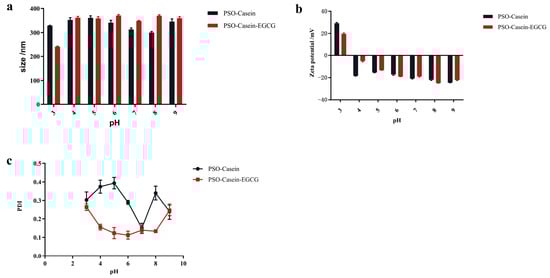 Particle size, zeta potential, and PDI of PSO–casein and PSO–casein–EGCG microemulsions at pH 3–9. Influence of pH value on (a) particle size, (b) particle zeta potential, and (c) particle PDI.