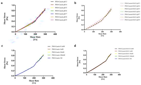 (a) Shear stress of PSO–casein with pH 3–9 under shear rate of 0–300 [1/s]. (b) Shear stress of PSO–casein–EGCG with pH 3–9 under shear rate of 0–300 [1/s]. (c) Shear stress of PSO–casein at the ionic strength of 0.1–1 M under shear rate of 0–300 [1/s]. (d) Shear stress of PSO–casein–EGCG at ionic strength of 0.1–1 M under shear rate of 0–300 [1/s].