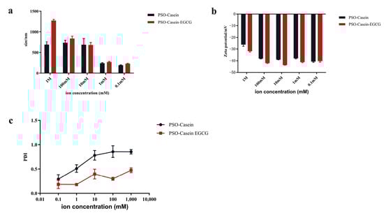 Particle size, zeta potential, and PDI of PSO–casein and PSO–casein–EGCG microemulsions at ion concentration (0.1–1 M). Influence of ionic strength on (a) the particle size, (b) particle zeta potential, and (c) particle PDI of PSO–casein and PSO–casein–EGCG microemulsions.