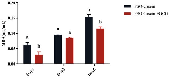 TBARS is an indicator of secondary oxidation product formation and correlates well with the labeling of secondary oxidation products from lipid oxidation in microemulsions [27,28]. TBARS was measured to further detect the oxidation stability of PSO microemulsions. As shown in Figure 5, after 5 days of storage, MDA increased significantly and gradually with the increase in time, which indicated that lipid oxidation occurred in both systems. In the same storage time, the MDA content of the PSO–casein complex increased from 0.062 mg/mL to 0.154 mg/mL, but the MDA content of the PSO–casein–EGCG microemulsion only increased from 0.030 mg/mL to 0.115 mg/mL. Therefore, microemulsions with EGCG have better oxidation stability than complexes without EGCG. This phenomenon may be due to EGCG in microemulsions reducing the degree of oxidation and extending the stabilization time of PSO [29]. In addition, casein as an emulsifier could prevent contact between PSO and oxygen, rendering the microemulsion system stabler [30].