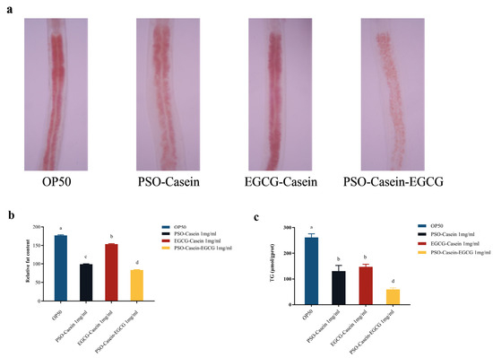The fat of C. elegans is primarily stored in intestinal epithelial cells and the gut. ORO staining is a method used to evaluate the overall fat content of nematodes, and it has a good correlation with triglyceride (TG) content [17]. In this study, we quantified fat accumulation in nematodes using ORO staining and TG content measurement to comprehensively evaluate the lipid-lowering effects of microemulsions. As shown in Figure 6a,b, after quantifying the staining intensity, the staining results indicated that compared with the blank group, the fat accumulation in nematodes treated with the PSO–casein microemulsion and PSO–casein–EGCG microemulsion was significantly reduced by 44.32% and 52.56%, respectively (p < 0.05). Compared with nematodes treated with EGCG–casein microemulsion, those treated with the PSO–casein–EGCG microemulsion exhibited a significant reduction in lipid accumulation. TG assay results also showed a similar trend, with lipid accumulation in nematodes treated with the PSO–casein microemulsion and PSO–casein–EGCG microemulsion significantly reduced by 50.00% and 77.50%, respectively (Figure 6c). The discrepancy between ORO staining results and TG measurement results may be due to other lipophilic substances also being stained by ORO [31]. The PSO–casein–EGCG microemulsion exhibited stronger lipid-lowering effects than the PSO–casein microemulsion, indicating that EGCG can enhance the lipid-lowering effects of the PSO–casein microemulsion. In summary, these data strongly suggest that the PSO–casein–EGCG microemulsion has a significant effect in reducing fat accumulation.