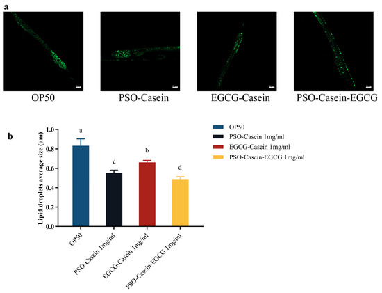 Lipid droplets are eukaryotic organelles that store neutral fats such as triacylglycerol and cholesterol esters [17]. Lipid droplets play an important role in energy utilization and storage in mammals and C. elegans [18]. Many of the fat-regulating genes found in C. elegans are homologous with mammals. Strain ZXW618 is a transgenic worm that fuses green fluorescent protein (GFP) fusion to express lipid droplet marker protein DHS-3, and lipid droplets can be clearly observed in strain ZXW618 [17]. Since the PSO–casein–EGCG microemulsion reduced fat accumulation in nematodes, its effect on the lipid droplet size of nematodes was studied. Compared with the nematodes in the control group, no significant difference was detected in the average number of lipid droplets (p > 0.05, Figure 7), but a 33.53% decrease and 41.23% decrease in lipid droplet size was observed in those treated with PSO–casein and PSO–casein–EGCG microemulsions, respectively. These results indicated that PSO microemulsions can reduce fat accumulation in the form of lowering lipid droplet size in nematodes. Therefore, microemulsions could enhance the lipid-lowering properties of PSO and are effective in protecting the stability of PSO. In addition, studies have shown that curcumin-loaded microemulsion enhanced bioaccumulation and reduced fat content of C. elegans [34]. Vitamin E contained in almond oil or neem oil has good stability and enhanced anti-inflammatory activity [35], indicating that developing a transport system for a bioactive compound could improve stability and utilization and better utilize their activity.